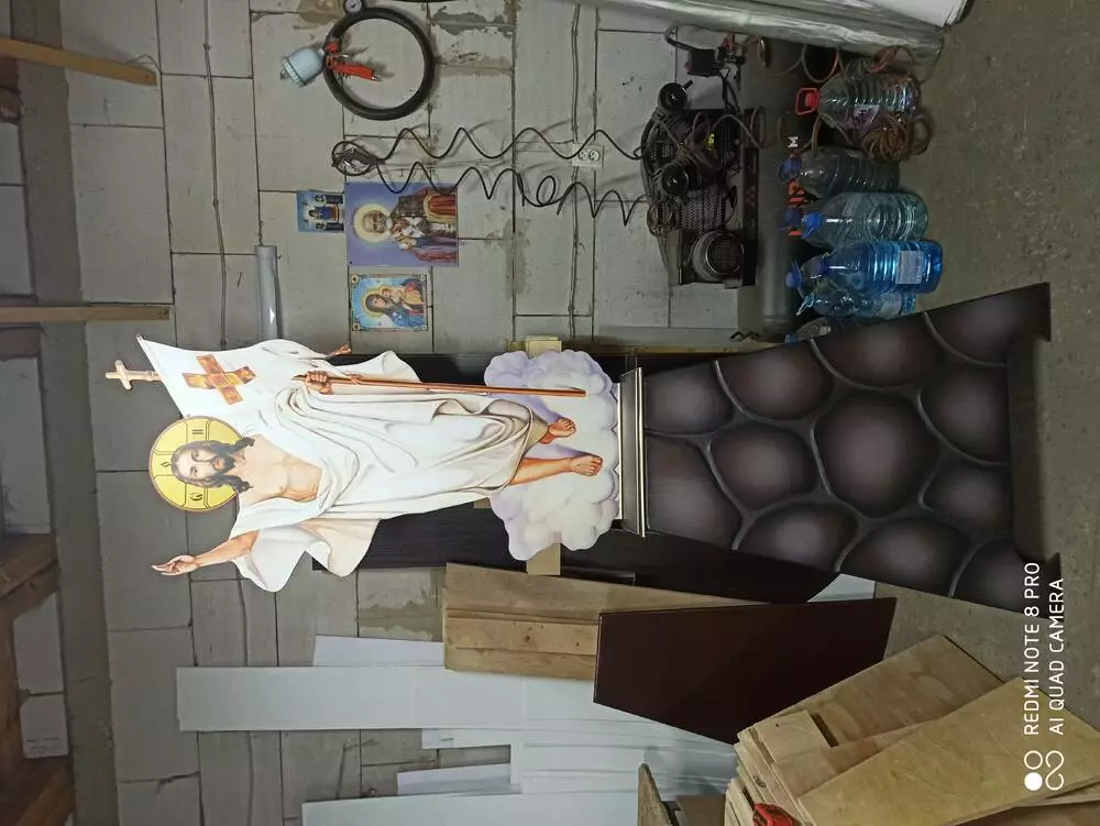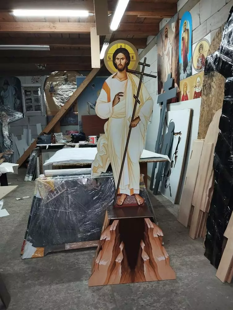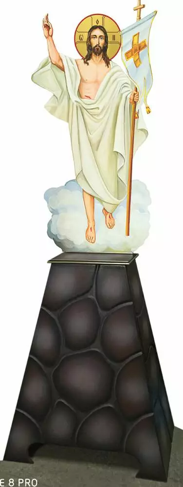 Воскресіння Христове купити Ви можете у нас. Виготовляємо воскресіння з фанери (15 мм), літографія друкована, ламінована. Габарити: висота воскресіння - 2,1 м, ширина - 1,3 м. Воскресіння складається з двох частин: верх - Спаситель з ангелами, і низ - фрезований під камінь.
