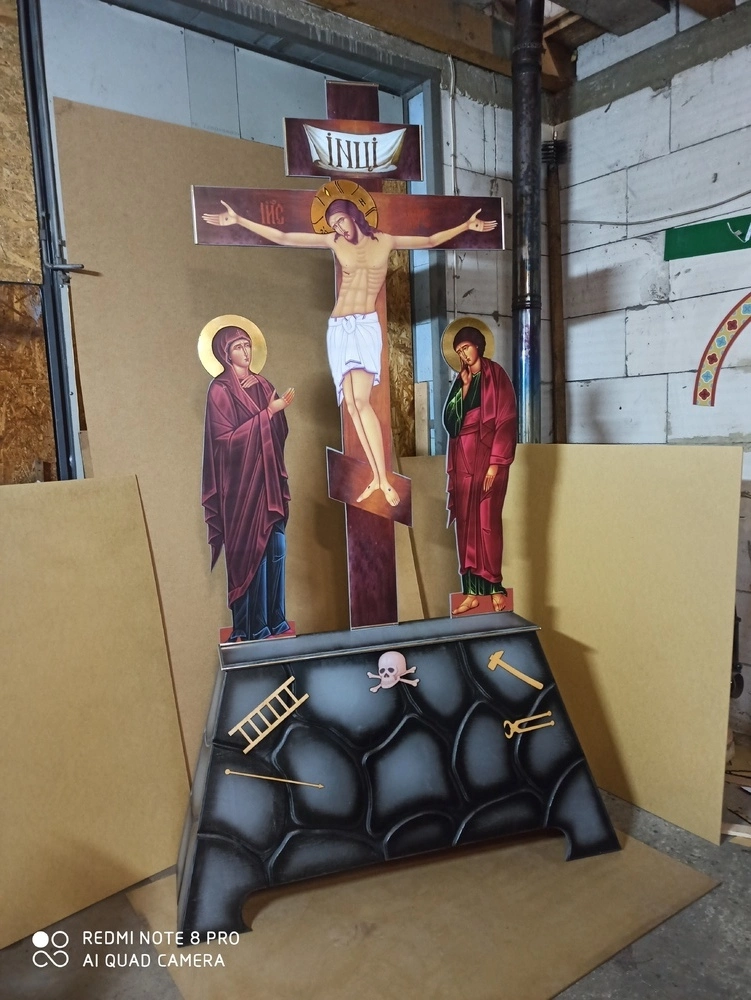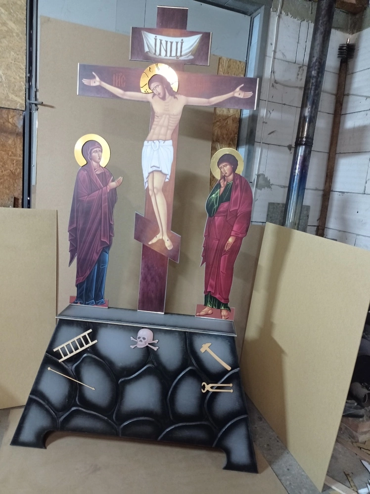 Голгофа храмова складається з двох частин: верх і низ. Верх - це хрест із Спасителем в повний ріст, по праву руку Христа зображається Діва Марія, по ліву - образ Іоанна Богослова. Літографія розп'яття друкована на плівці, ламінована. Низ розп'яття фрезований під камінь із зображенням на ньому черепа (Голова Адама), драбини, молотка. Матеріал виготовлення голгофи-фанера 15 мм.