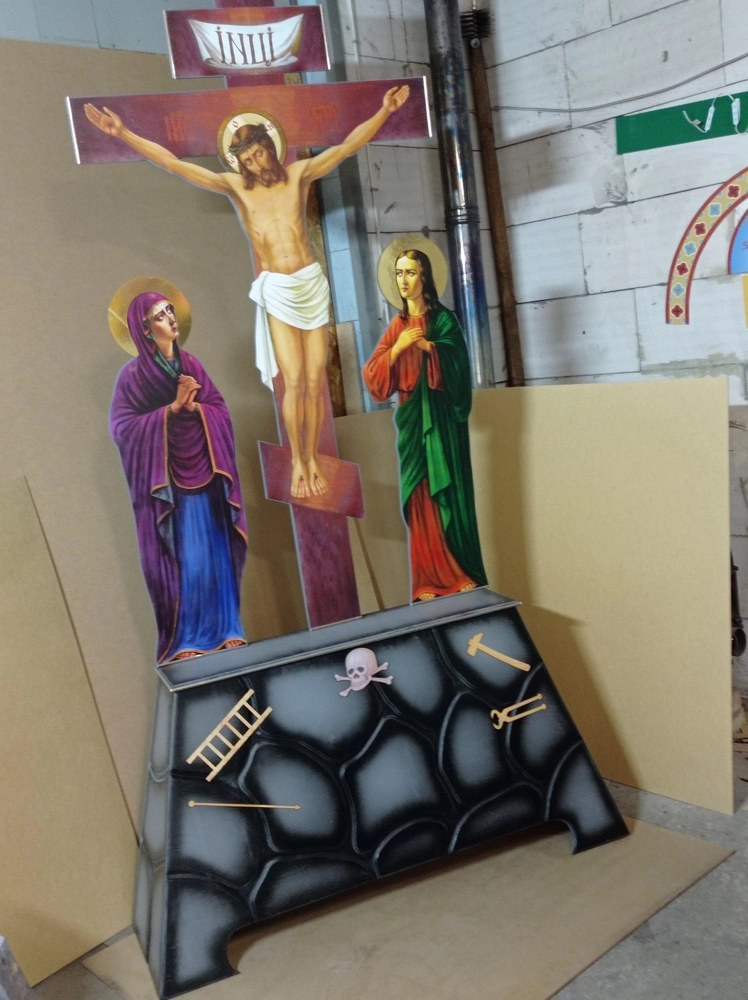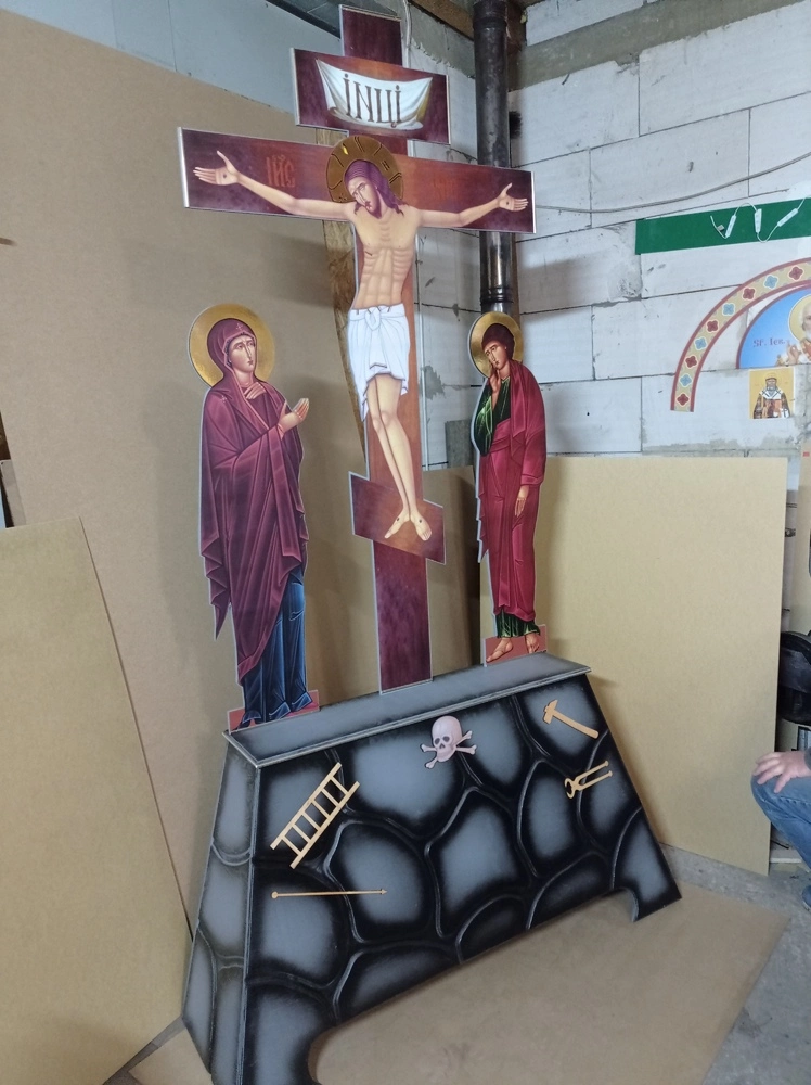 Майстерня Пономар займається виготовленням голгоф під замовлення. Ми виготовляємо два види голгоф: в повний зріст і на жертовники (аналойні). Голгофа виготовляється з фанери (МДФ) 15 мм. Голгофа в повний зріст складається з двох частин: верх - це хрест зі Спасителем, нижня частина - різьблення по дереву "під камінь". Літографія друкована на плівці, ламінована.