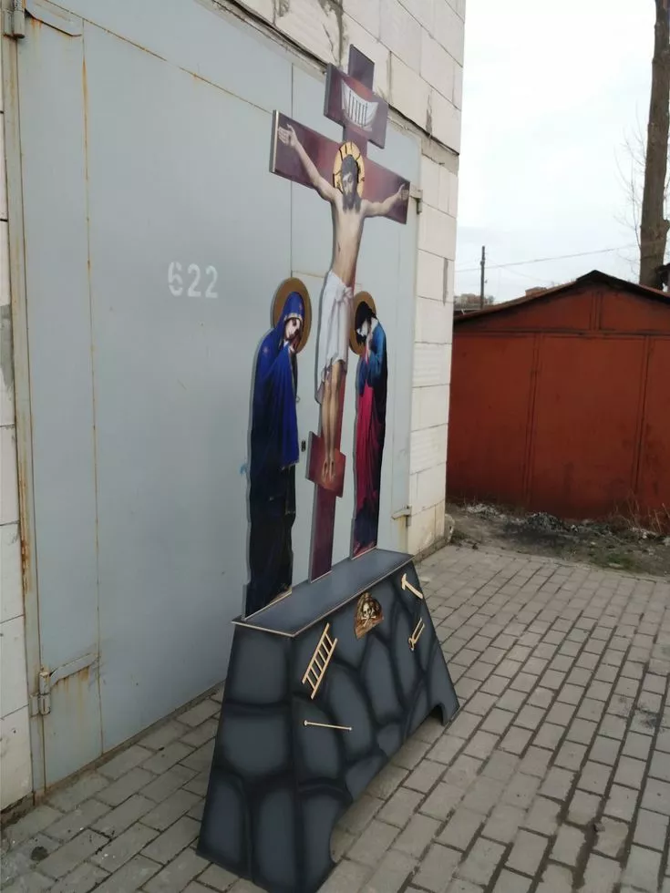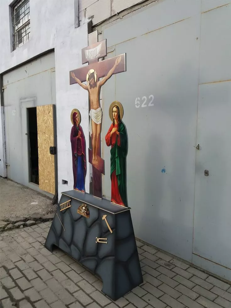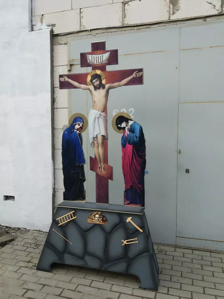 Наша мастерская предлагает Вам два вида голгоф: на жертвенники и в полный рост. Голгофа изготовляется из фанеры (МДФ) 15 мм. Голгофа в полный рост состоит из двух частей: верх и низ. Верх это крест со Спасителем. Литография печатная на пленке, ламинированная. Низ распятие фрезерованные под камень с изображением на нем черепа, лестницы и молотка.