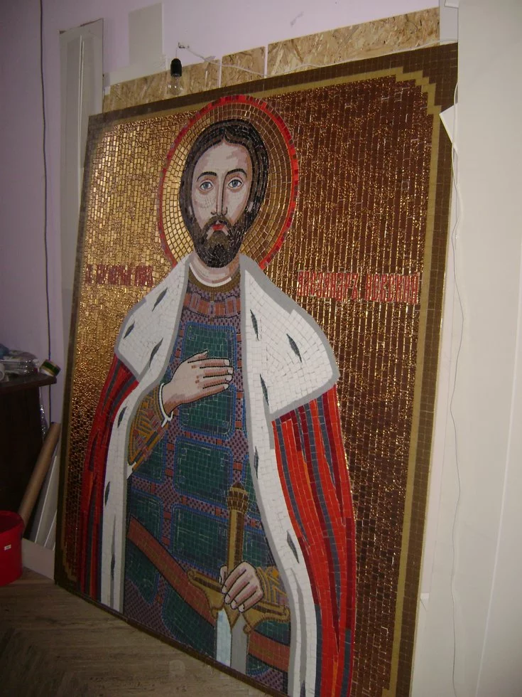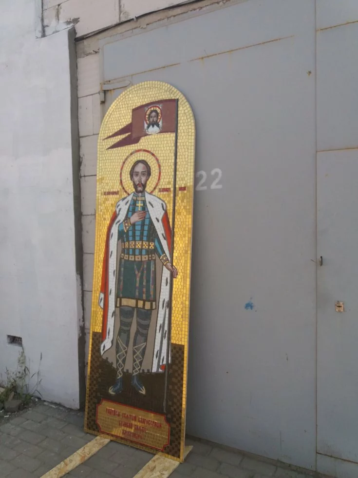 Икона Александр Невский выполнена из стеклянной мозаики. Такие иконы и мозаичное оформление широко используется в храмах и церквях по Украине, и не только.
