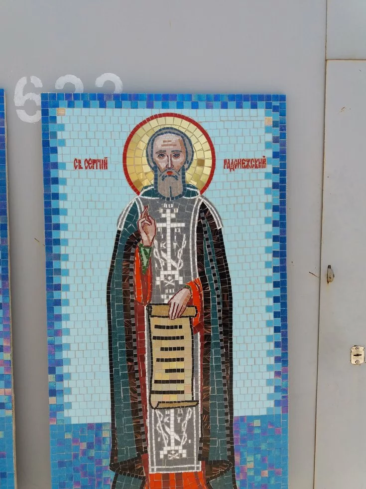 Мозаичные изображения широко используют при украшении фасадов и при внутреннем оформлении храмов, церквей. Икона из мозаики Сергий Радонежский - один из вариантов наших работ.