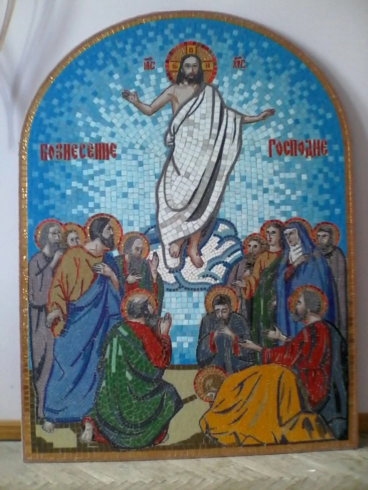 Икона Вознесение из мозаики станет украшение любого христианского храма. Мастерская Пономарь занимается изготовлением мозаичных икон со святыми.