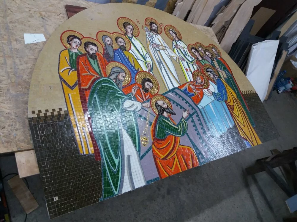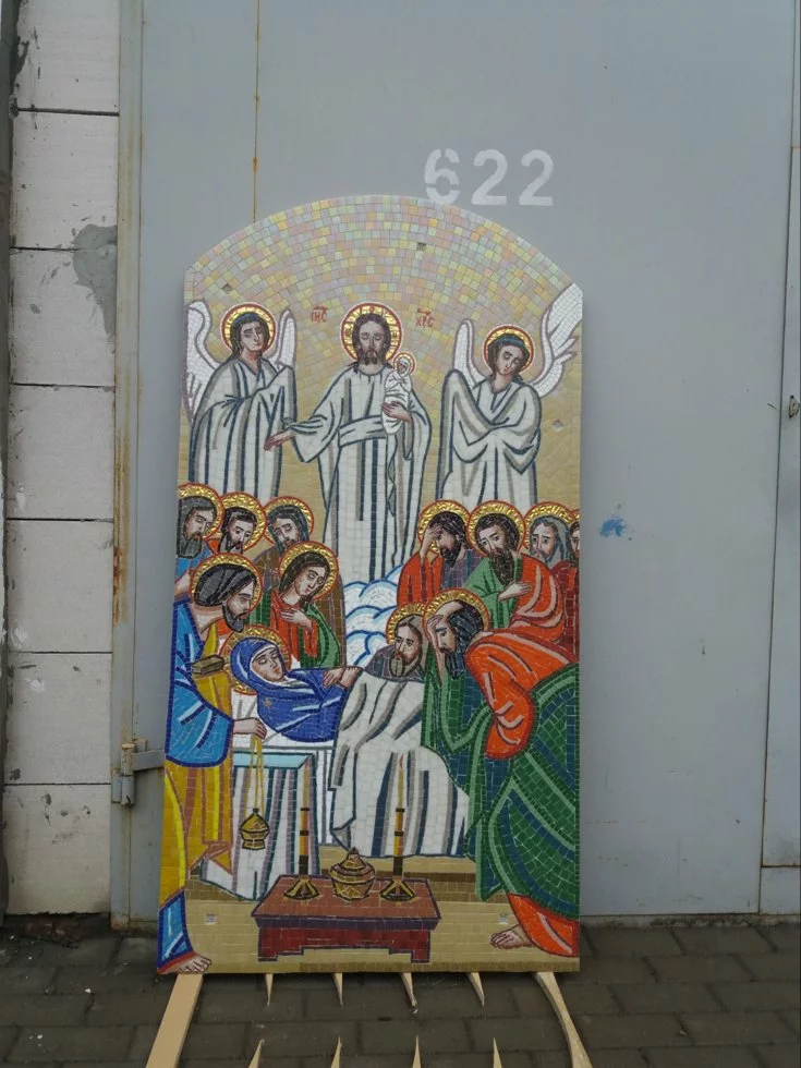 Иконы с мозаики изготовляем разных размеров и форм, сначала делаем макет, а потом икону. Делаем мозаику на осб основе и на монтажной сетке. Работаем по всей Украине.