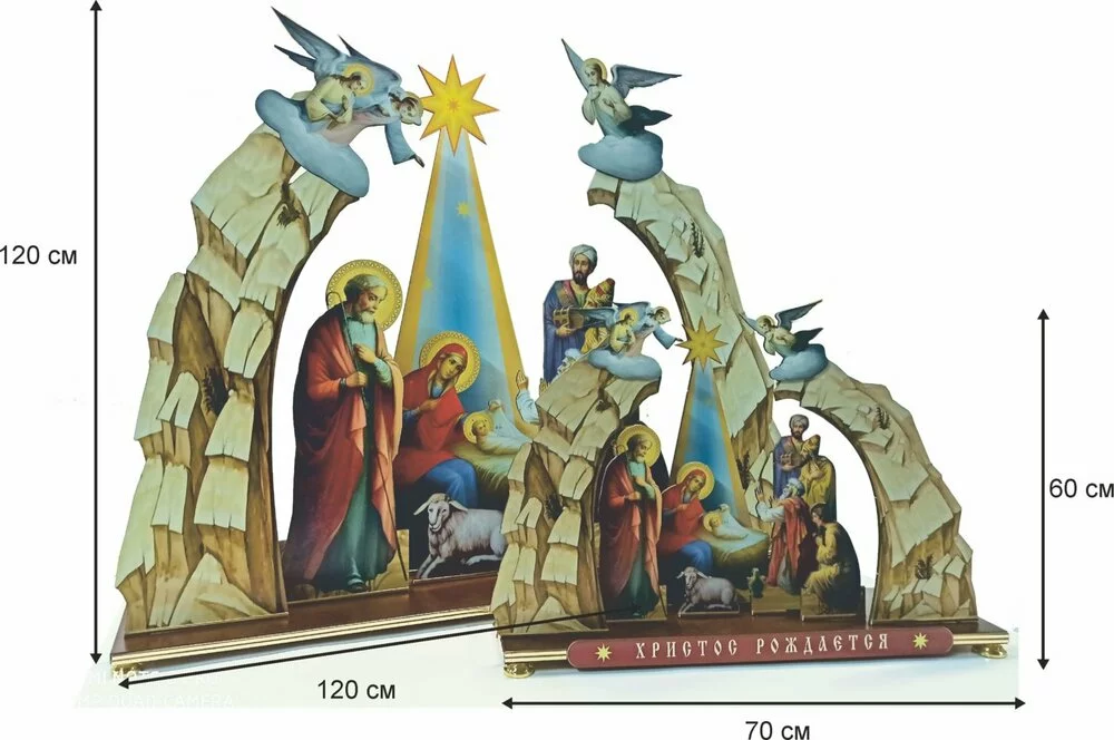 Размер вертепа: ширина 0,70, высота 0,60 м. Вертеп полностью разборный, материал из которого изготовлено МДФ, печатная литография. Используются на улице и в нутри храма.