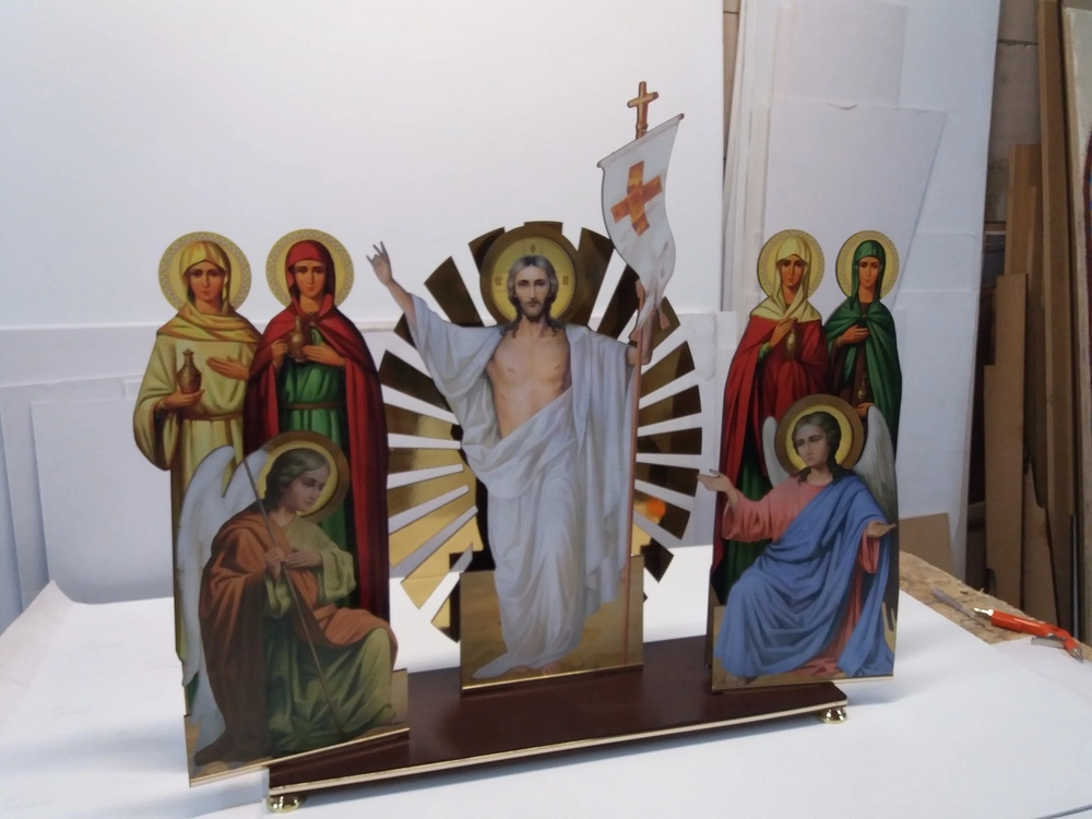 Воскресение Христово — основа нашей веры. В храмах к празднику святой Пасхи устанавливают Воскресенья. Мастерская Пономарь занимается изготовлением церковной атрибутики, в частности у нас Вы можете заказать воскресенья господние, голгофы, распятия, вертепы, а также иконы (из мозаики и иконы на пластике для иконостаса) на по нужным Вам размерам.